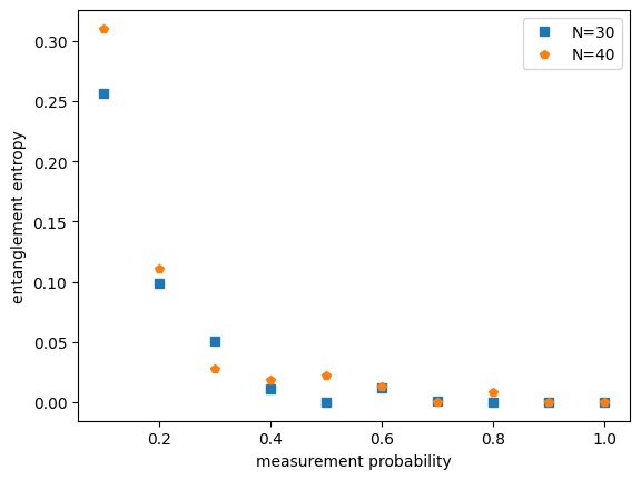 Finally, we can plot the average entanglement entropy as a function of the measurement probability for different system sizes: