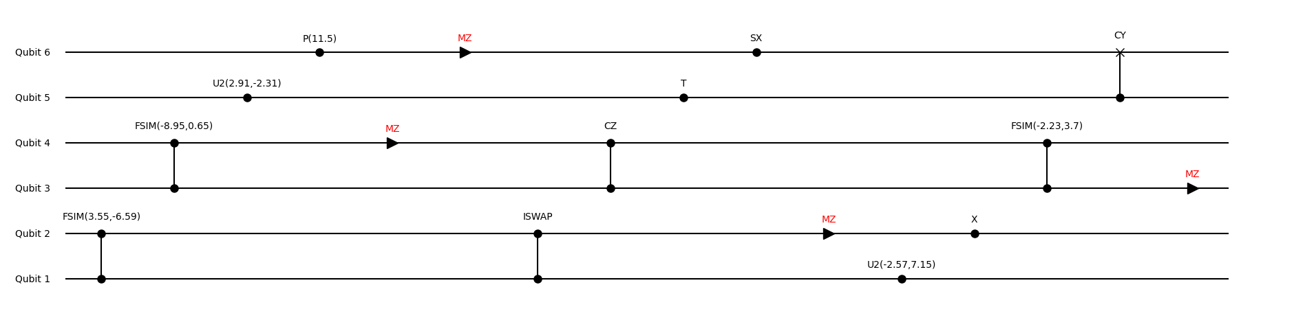 ops = random_ops(N, depth; measure_prob=0.1, measure_basis=["MZ"]) # Measurement probability is 0.1 and the basis is Z.