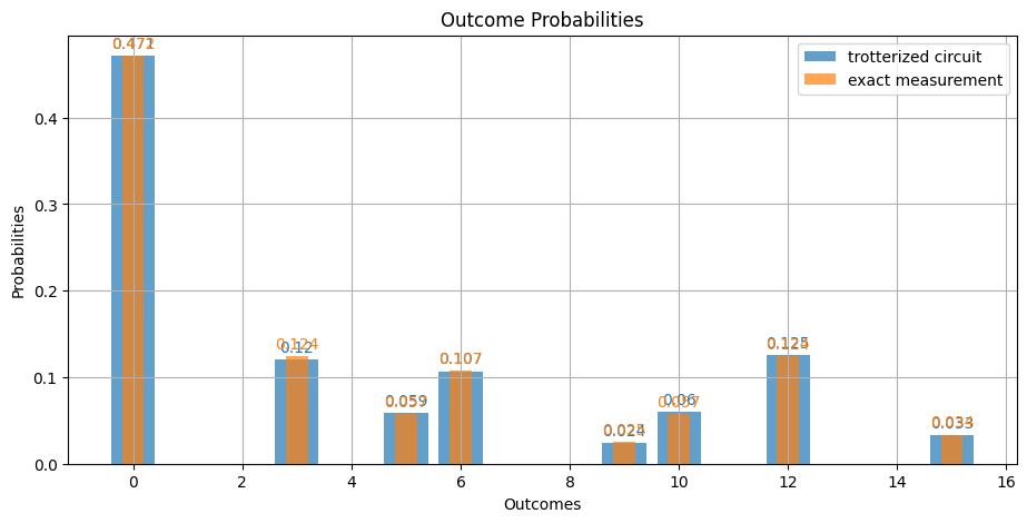 Comparing the Trotterized evolution with the exact calculation allows us to assess the accuracy of the approximation. The agreement between the two results depends on the size of the time step and the total simulation time. Smaller time steps generally lead to better approximations but also increase the circuit depth.