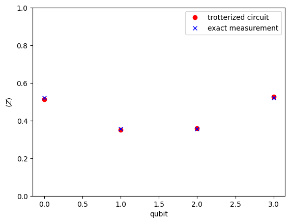 We can then plot the measurement results from both the Trotterized circuit and the exact calculation: